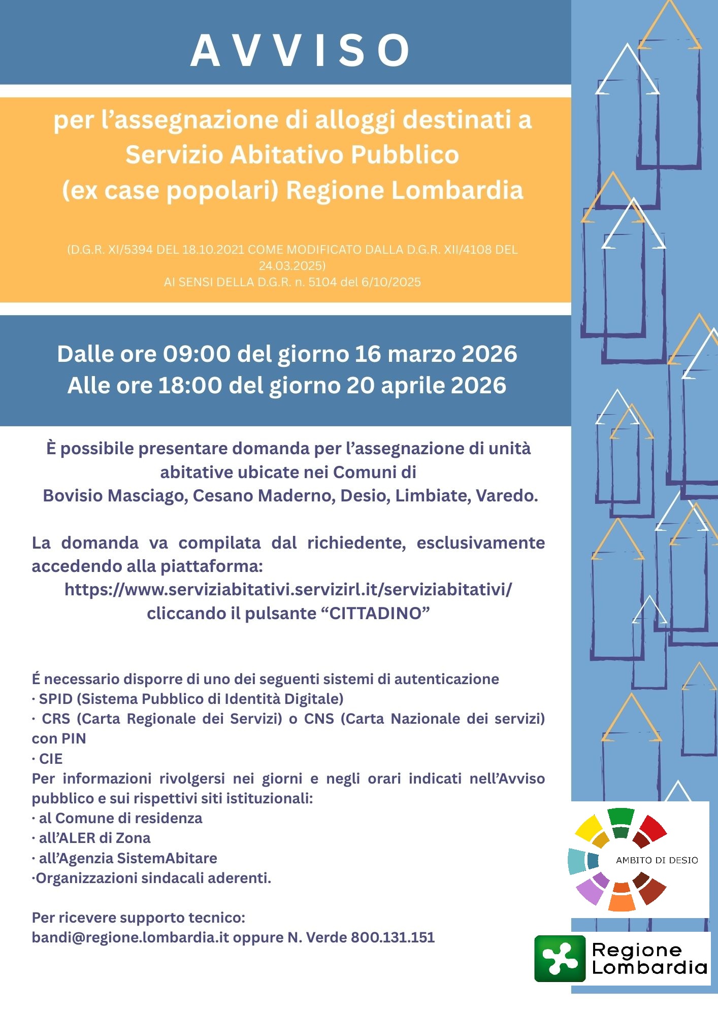 Apertura Avviso Sap (l’avviso pubblico per l’assegnazione delle unità abitative disponibili destinate ai servizi abitativi pubblici) .n. 12702 – periodo di apertura e di chiusura bando dalle h. 9.00 del 16 marzo 2026 alle ore 18.00 del 20 aprile 2026-.