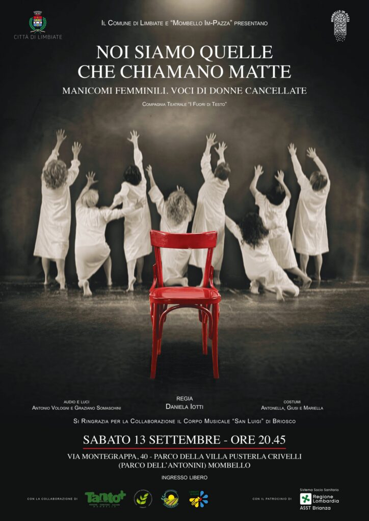 Lo spettacolo “Noi siamo quelle che chiamano matte” (regia di Daniela Iotti) proposto dalla compagnia “i Fuori di testo” di Briosco verrà messo in scena sabato 13 settembre alle 20.45, all’aperto, nel suggestivo contesto del Parco dell’Antonini, con le scenografie viventi della Villa Pusterla Crivelli. Uno spettacolo coinvolgente e drammatico che parla di storie di donne internate alla Salpetriere di Parigi nell’800 quando l’isteria metteva in scacco i migliori neurologi dell’epoca che non riuscivano a trovare la causa organica della malattia. Queste donne racconteranno sulla scena le loro storie, i loro drammi, i loro traumi nei legami con le persone importanti della loro vita. Una di loro ha un dono “particolare”, riesce a comunicare con le anime dei defunti ed è stata ricoverata perché ritenuta “pazza”, ma la sua storia prenderà una piega del tutto particolare…
